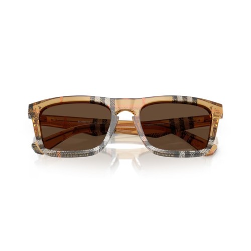 Κοκκάλινα γυαλιά ηλίου Burberry, διακοσμημένα με το χαρακτηριστικό καρό της Burberry σε μπες, μαύρους και κόκκινους τόνους.